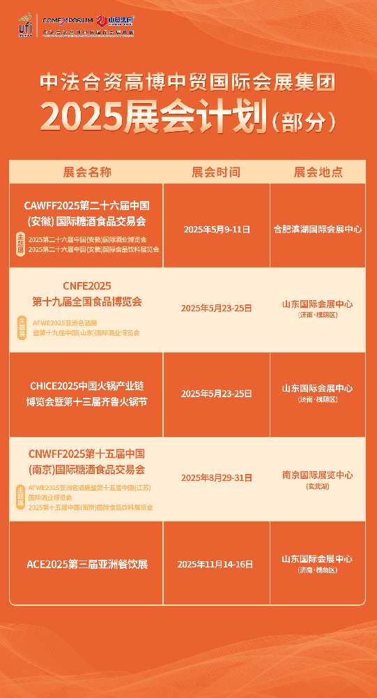 近日,中法合資高博中貿國際會展集團經過科學論證與研討,確定了旗下部分重要展會的舉辦檔期。其中,CAWFF2025第二十六屆中國 (安徽)國際糖酒食品交易會將于2···