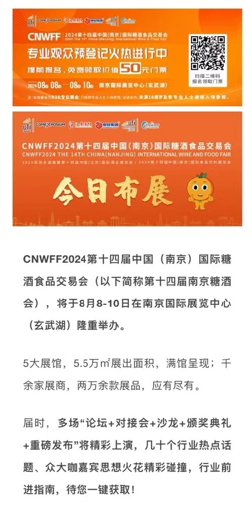 CNWFF2024第十四屆中國(南京)國際糖酒食品交易會(以下簡稱第十四屆南京糖酒會),今日在南京國際展覽中心(玄武湖)開始布展,布展時間為8月6-7日兩天。8···